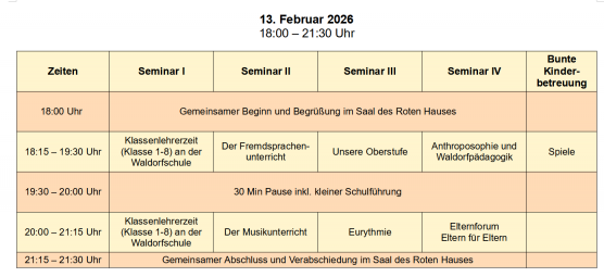 Unser Infoabend „Waldorfpädagogik erleben“ soll Ihnen als Eltern die Möglichkeit geben, Einblicke in unsere Pädagogik zu erhalten. Der Abend beginnt um 18:00 Uhr und beinhaltet zwei Kurseinheiten, in denen Sie zwischen verschiedenen Seminaren wählen können. Die angebotenen Seminare beleuchten Inhalte des Waldorfschulunterrichts und Fragen wie: Was ist eigentlich anders an der Waldorfschule? Was sind die Hintergründe? Nach welchen entwicklungspsychologischen Ideen wird der Unterricht am Kind aufgebaut? Der Abend endet mit einer gemeinsamen Verabschiedung um 21:30 Uhr.