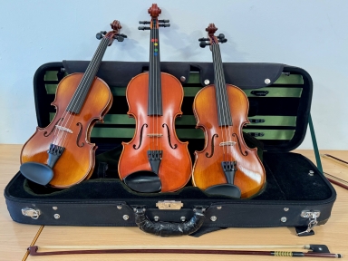 Die Streicherklassen spielen auf schuleigenen Streichinstrumenten. Vor Jahren hat unsere Schule Geigen und Celli gebraucht von einer anderen Schule gekauft. Nach und nach konnte ein Teil der teilweise erheblich beschädigten Instrumente durch Spenden des Lionsclubs und des Rotaryclubs repariert werden. Aktuell fehlten jedoch unseren Streicherklassen drei Geigen und Zubehör wie Geigenbögen und Schulterstützen.