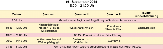 Wir starten um 18:00 Uhr mit einer Begrüßung im Eurythmiesaal (Rotes Haus). Angeboten werden zwei Kurseinheiten. In jeder Kurseinheit können sie zwischen theoretischen und praktischen Angeboten wählen. In der Pause besteht die Möglichkeit an einer Führung durch das Gelbe oder Blaue Haus teilzunehmen. Nach der 2. Kurseinheit um 21:15 Uhr möchten wir Sie zu einem Rückblick auf den Abend wieder in den Eurythmiesaal (Rotes Haus) einladen.